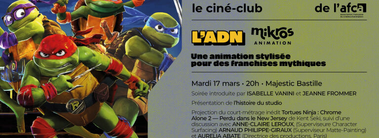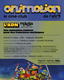 La seconde date du ciné-club Animotion aura lieu mardi 17 mars 2026 à 20h au cinéma Majestic Bastille. Au programme : présentation de l'histoire du studio, projection du court métrage Tortues Ninja : Chrome Alone 2 - Perdu dans le New Jersey de Kent Seki, projection du film NINJA TURTLES - TEENAGE YEARS de Jeff Rowe.